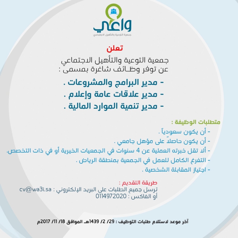 أعلنت جمعية التوعية والتأهيل الاجتماعي “واعي” توفر وظائف إدارية شاغرة للجنسين، للعمل بمقر الجمعية في مدينة الرياض، وذلك وفق مسميات الوظائف التالية: