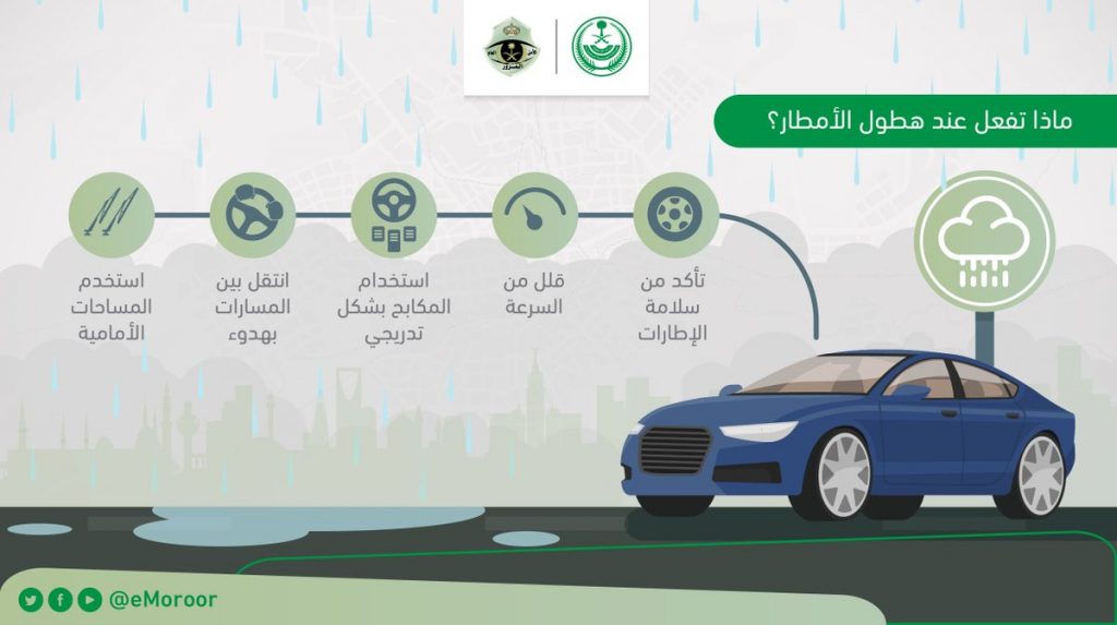 وكتبت إدارة المرور في تغريدة لها عبر حسابها الرسمي على موقع التواصل الاجتماعي “تويتر”: عزيزي قائد المركبة: نظرًا لهطول الأمطار هذه الأيام على معظم مناطق المملكة وما يصاحبه من تقلبات جوية، فنود التأكيد عليك بأخذ الحيطة والحذر والالتزام بقواعد السلامة اللازمة”.