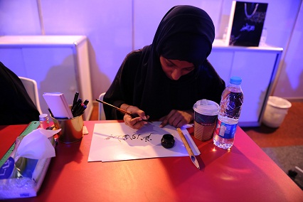 طوال خمس ساعات متواصلة، ينكب الخطاط السعودي الشاب راجا بلهادر على طاولة في إحدى زوايا معرض جدة للكتاب، ليس لقراءة كتاب بل لممارسة هوايته وحرفته التي شغف بها ولا يجد تثريبًا في قضاء مثل هذا الوقت كل يوم خلال أيام المعرض العشرة.