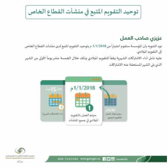 نوهّت المؤسسة العامة للتأمينات الاجتماعية إلى أنه اعتباراً من 2018/1/1 سيتم توحيد التقويم المتبع لدى منشآت القطاع الخاص إلى التقويم الميلادي.