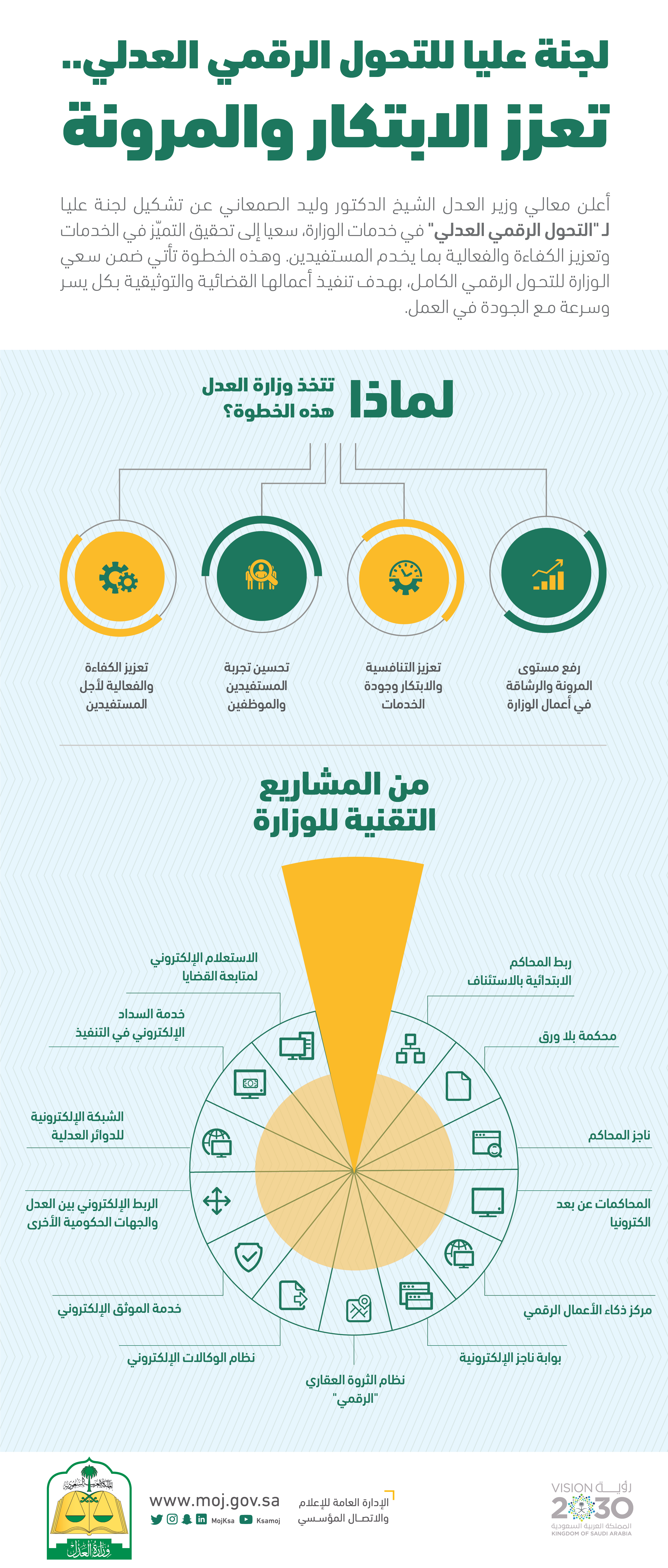 أكملت وزارة العدل تغطية 100% من دوائرها العدلية بالمنظومة الرقمية التقنية في جميع مناطق المملكة، بعد أن كانت العام المنصرم تُشغّل 2% من دوائرها القضائية بواسطة الأقمار الصناعية.