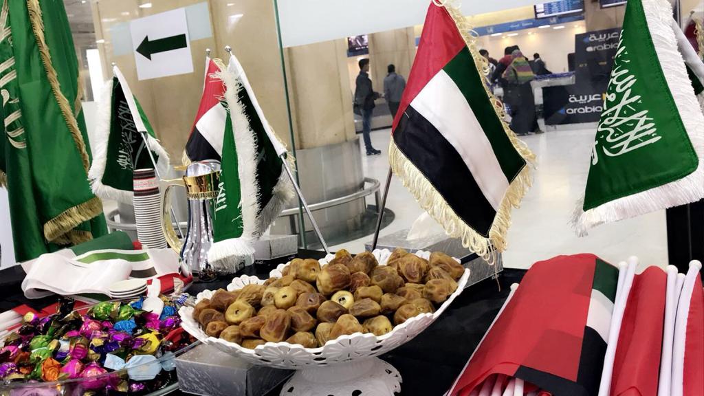 وقامت إدارة جوازات مطار الملك خالد بتوزيع الحلوى والهدايا، كما انتشرت اللافتات والأعلام الإماراتية في أرجاء المطار.