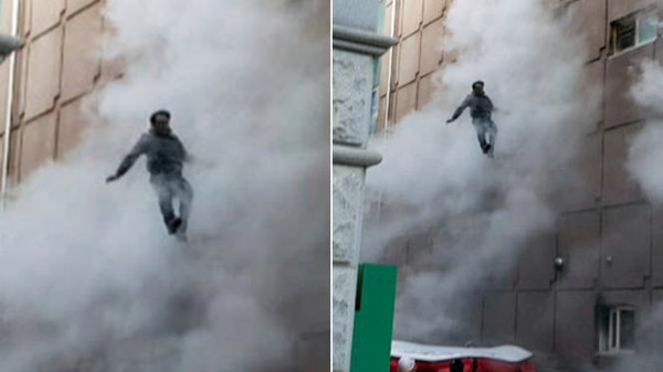 لحظة درامية تم توثيقها في صورة، عندما قفز رجل من أعلى مبنى مكون من ثمانية طوابق تعرض للحريق، حيث تم التقاطه بواسطة مرتبة هوائية فرشها رجال الإطفاء، أثناء المأساة التي وقعت في جيشيون بكوريا الجنوبية نهاية الأسبوع الماضي.