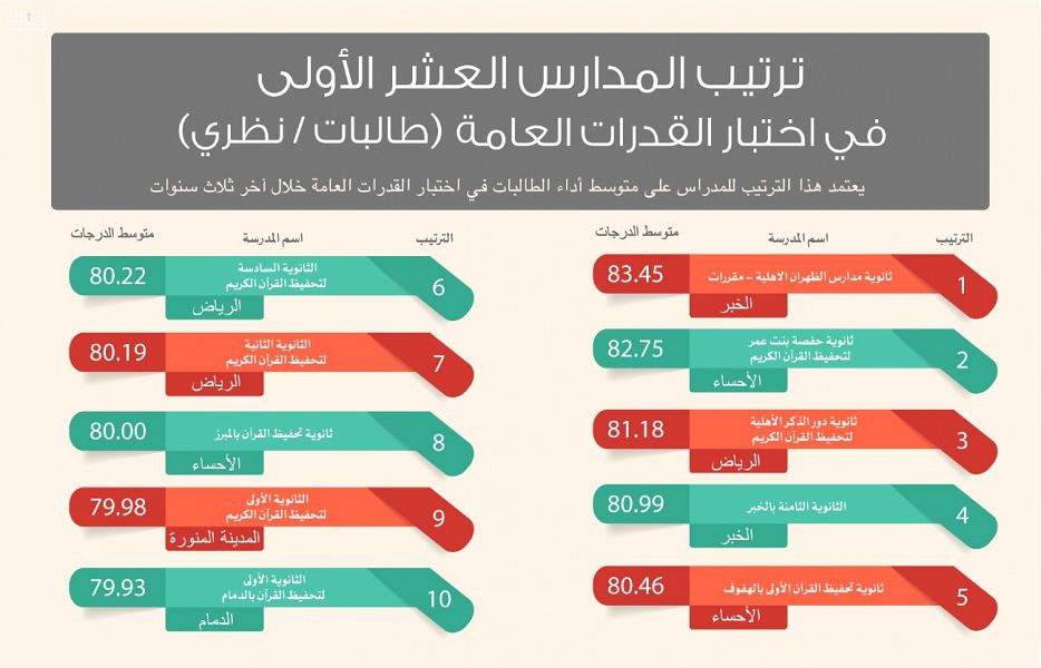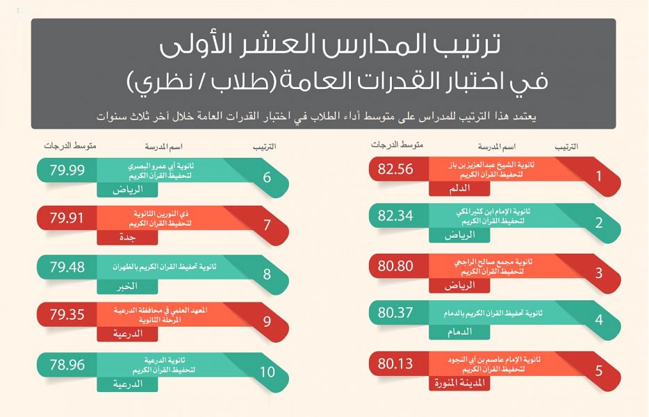 أعلن المركز الوطني للقياس التابع لهيئة تقويم التعليم، عن ترتيب المدارس الثانوية بالمملكة، وذلك بناءً على نتائج الطلاب والطالبات في اختباري القدرات العامة والتحصيل الدراسي خلال ثلاث السنوات الماضية.