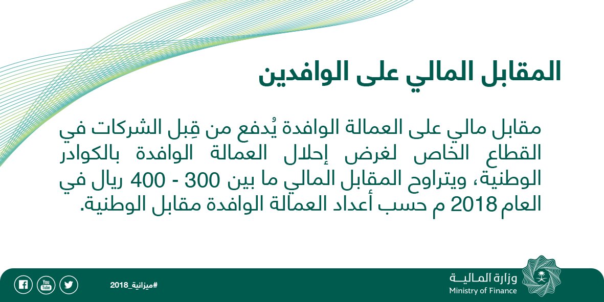 وبحسب إنفوجرافيك نشره الحساب الرسمي لوزارة المالية على موقع التواصل الاجتماعي “تويتر”، فإنه سيتم فرض مقابل مالي يتراوح بين 300 إلى 400 ريال في عام 2018، حسب أعداد العمالة الوافدة مقابل الوطنية.