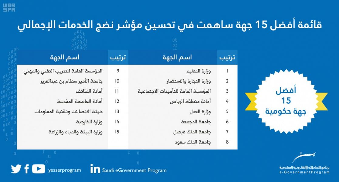 كما أشار التقرير إلى الجهات الحكومية التي ساهمت في تحسين مؤشر النضج الإجمالي لجميع الخدمات الحكومية، وهي وزارتا التعليم والتجارة والاستثمار، والمؤسسة العامة للتأمينات الاجتماعية، وأمانة منطقة الرياض، ووزارة العدل، وجامعتا المجمعة والملك فيصل وجامعة الملك سعود، والمؤسسة العامة للتدريب التقني والمهني، وجامعة الأمير سطام بن عبدالعزيز، بالإضافة إلى أمانة الطائف وأمانة العاصمة المقدسة، وهيئة الاتصالات وتقنية المعلومات فضلاً عن وزارتي الخارجية، والبيئة والمياه والزراعة.