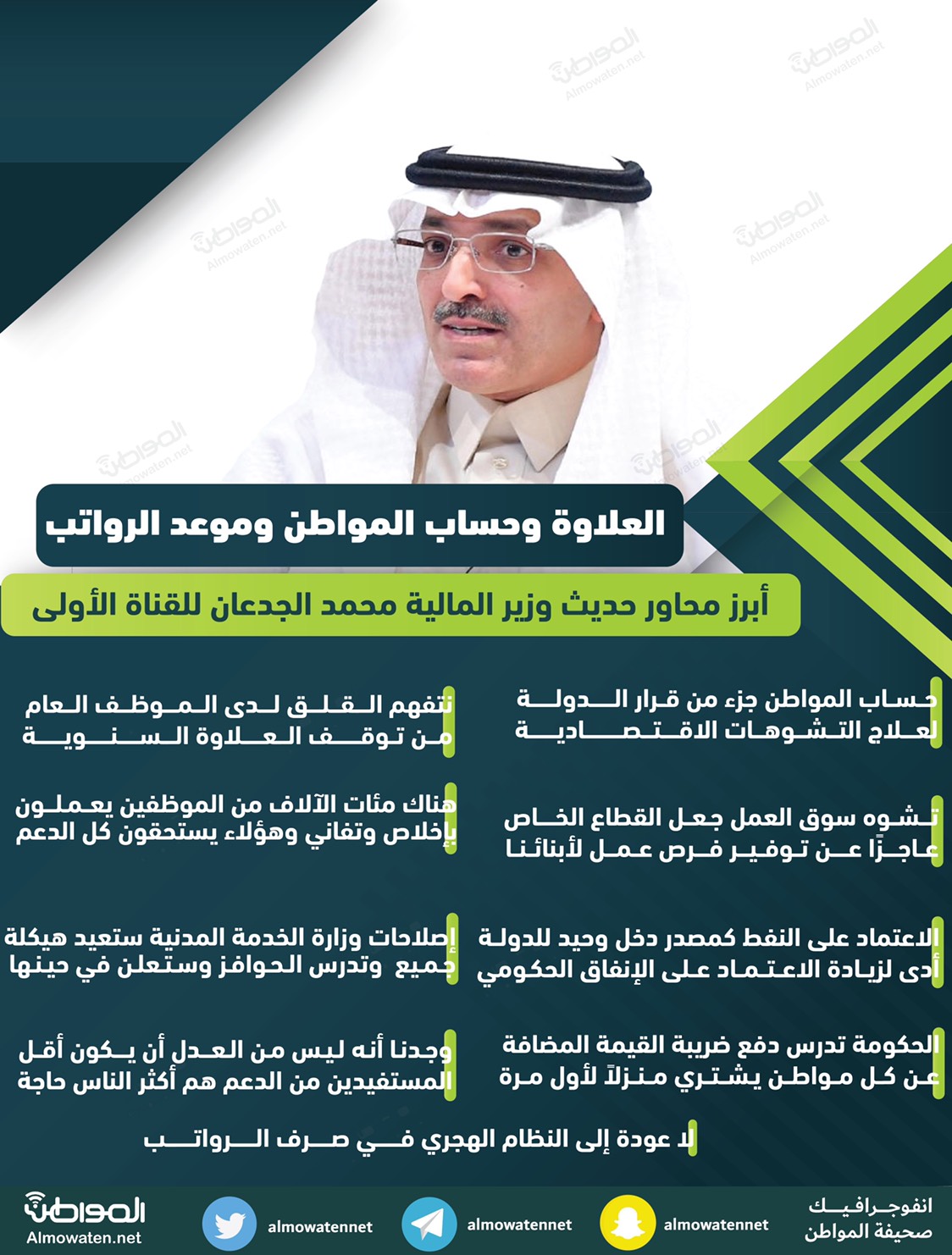 المواطن” بدورها سلطت الضوءَ على أبرز محاور لقاء وزير المالية محمد الجدعان على شاشة السعودية الأولى بالإنفوجرافيك كما يلي: