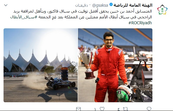 أعلنت الهيئة العامة للرياضة، عبر حسابها الرسمي على موقع التدوينات القصيرة “تويتر”، عن تحقيق المتسابق أحمد بن خنين لأفضل توقيت في سباق فاكتور.