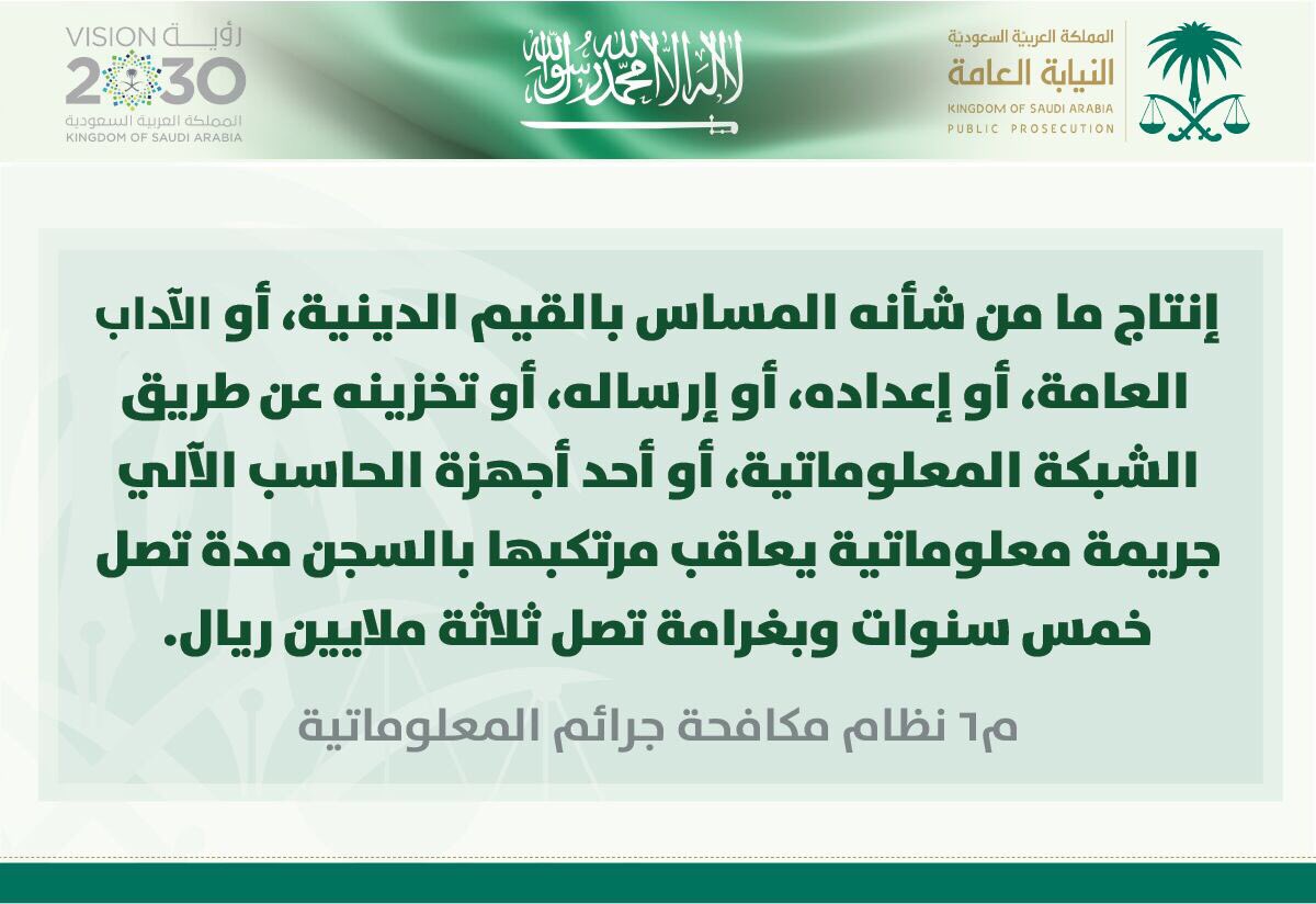 وأوضحت النيابة العامة، في تغريدة له عبر حسابه الرسمي بموقع “تويتر”، أن “إنتاج ما من شأنه المساس بالقيم الدينية أو الآداب العامة، أو إعداده أو إرساله، أو تخزينه عن طريق الشبكة المعلوماتية، أو أحد أجهزة الحاسب الآلي، يعدّ جريمة معلوماتية، والعقوبة في مثل تلك الجريمة تصل إلى لسجن لمدة 5 سنوات أو غرامة 3 ملايين ريال”.