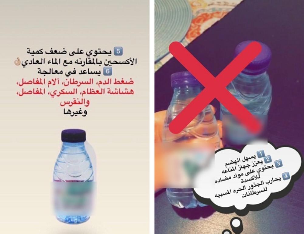 يُذكر أن إحدى ناشطات مواقع التواصل الاجتماعي نشرت عبر حسابها في “سناب شات” إعلاناً لمنتج مياه، زعمت أنه يسهل الهضم، ويعزز جهاز المناعة، ويحتوي على مواد مضادة للأكسدة، ويحارب الجذور الحرة المسببة للسرطانات.