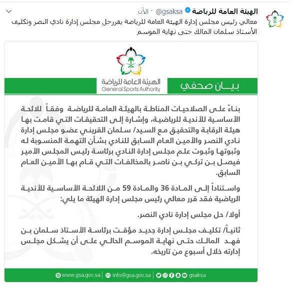 وقال بيان الهيئة على “تويتر”: “بناءً على الصلاحيات المناطة بالهيئة العامة للرياضة، وفقًا للائحة الأساسية للأندية الرياضية، وإشارة إلى التحقيقات التي قامت بها هيئة الرقابة والتحقيق مع السيد سلمان القريني عضو مجلس إدارة نادي النصر والأمين العام السابق للنادي بشأن التهمة المنسوبة له وثبوتها وعلم مجلس إدارة النادي برئاسة رئيس المجلس الأمير فيصل بن تركي بن ناصر بالمخالفات التي قام بها الأمين العام السابق”.
