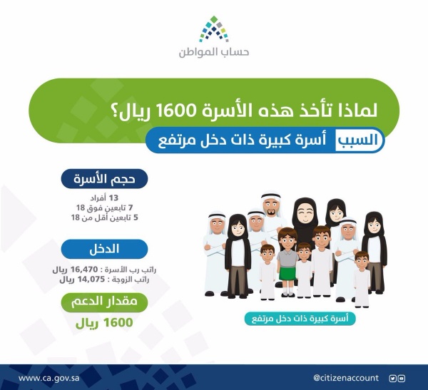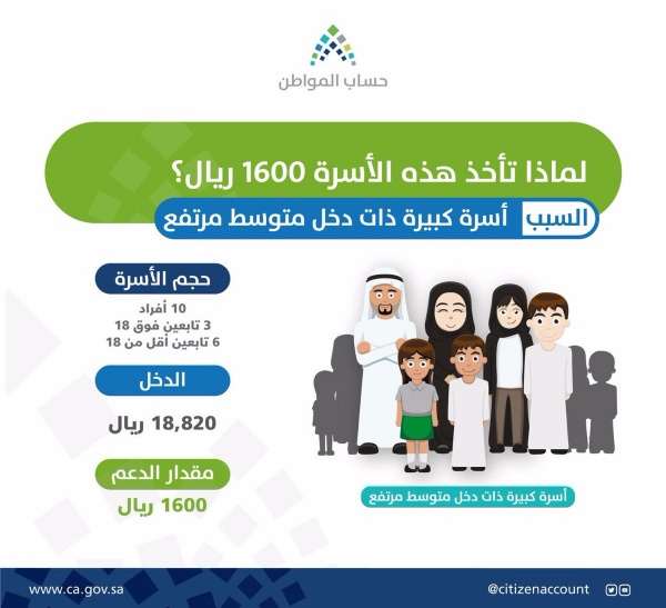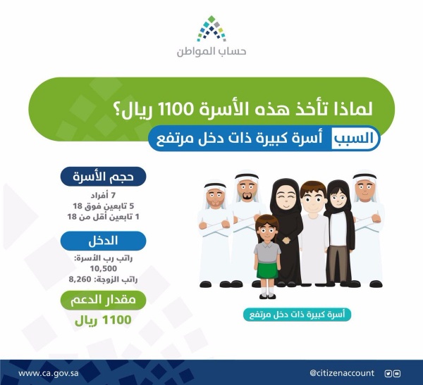وأضاف حساب المواطن على سبيل المثال، سبب حصول أسرة على دعم قيمته 1100 ريال، مبينًا أن هذه أسرة متوسطة، ودخلها متوسط، موضحاً أن هذه الأسرة تتكون من 6 أفراد (2 تابعين فوق 18 عامًا و3 تابعين تحت 18 عامًا)، مبينًا أن دخلها يبلغ (12.550) ريالاً، ليكون مقدار الدعم في النهاية هو 1100 ريال، وفقًا لحاسبة حساب المواطن.