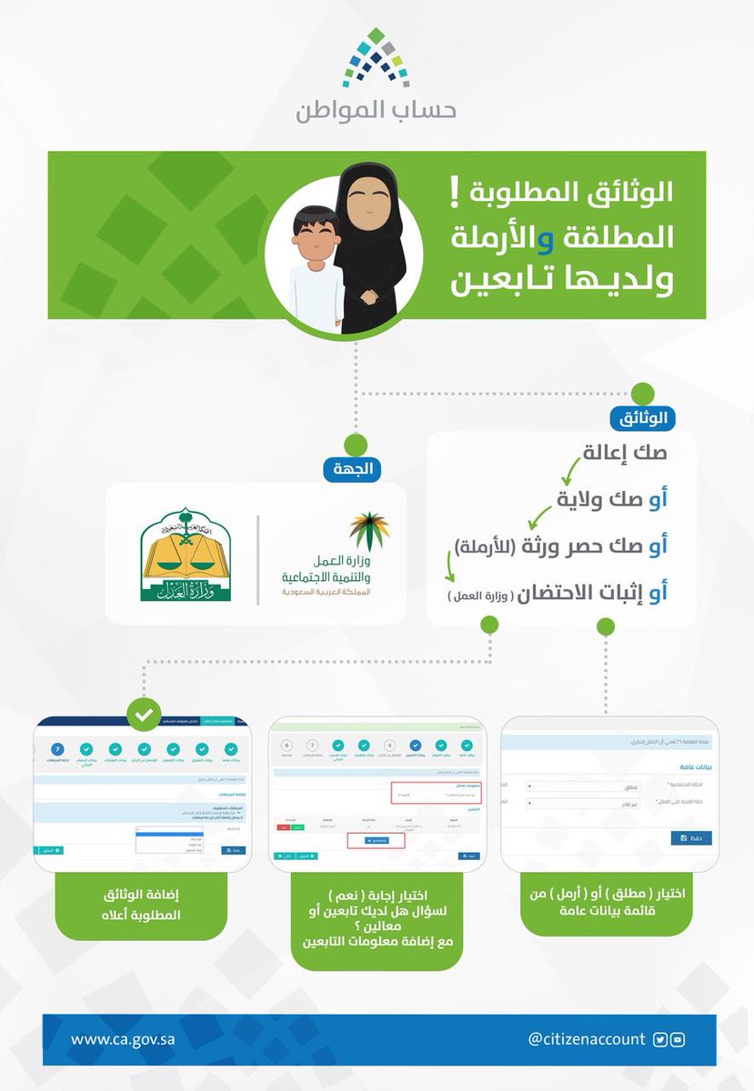 وأضاف حساب المواطن، في تغريدة عبر حسابه في “تويتر”، أن الوثائق المطلوبة لتسجيل المرأة كربة أسرة إذا كانت مطلقة أو أرملة ولديها تابعون هي: