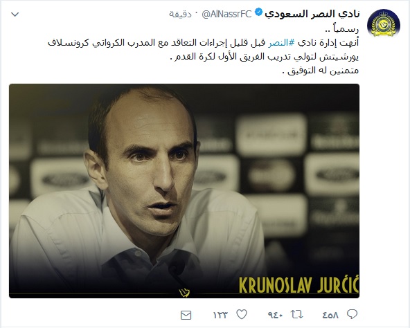 وأكد حساب نادي النصر الرسمي على موقع التدوينات القصيرة “تويتر”، أن مجلس الإدارة أنهى، قبل قليل، إجراءات التعاقد مع كرونسلاف يورشيتش، وتمنى له التوفيق خلال الفترة المقبلة.