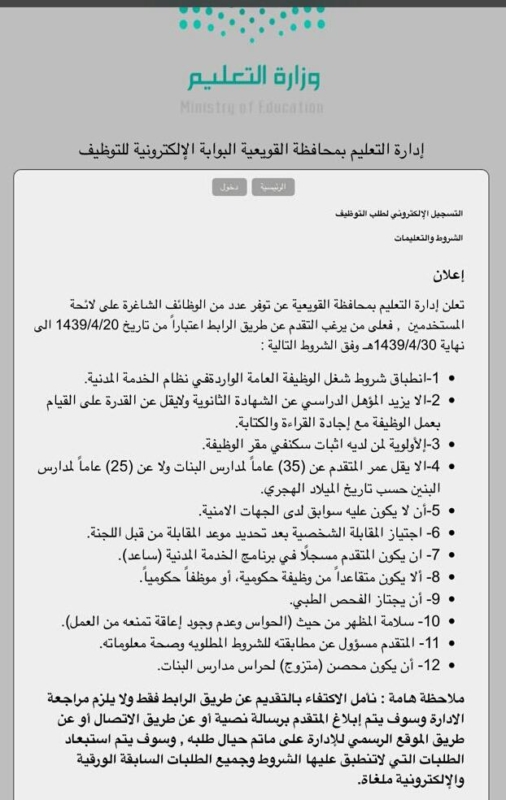 وأكد المتحدث الرسمي لتعليم القويعية، عبدالرحمن الشافي، أن التقدم على الوظائف المعلن عنها يكون من خلال رابط التقديم المعلن عنه على موقع الإدارة الرسمي، وعلى حساب الإدارة في “تويتر”، ولا يستدعي الحضور للإدارة. وأضاف الشافي بأن على المتقدمين التأكد من انطباق الشروط عليهم؛ حيث سيستبعد كل من لا تنطبق عليه الشروط.