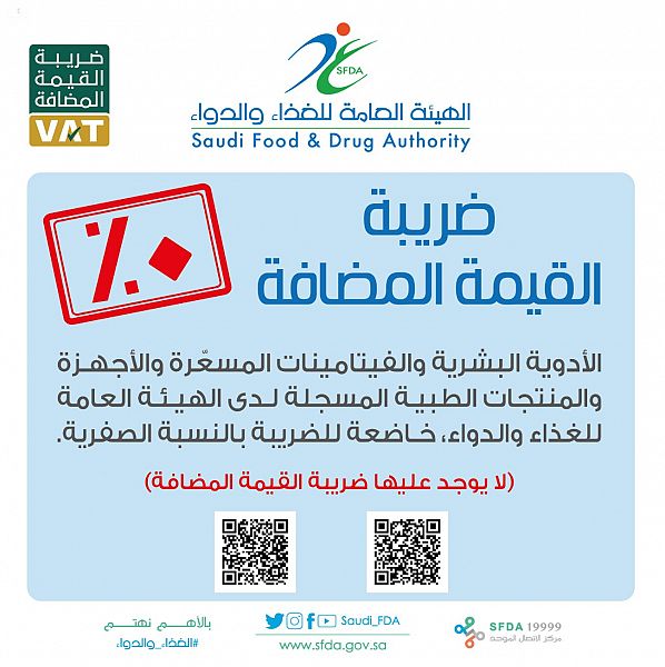 أوضحت الهيئة العامة للغذاء والدواء، أن الأدوية البشرية والفيتامينات المسعّرة والأجهزة والمنتجات الطبية المسجلة لدى الهيئة لا تُطبق عليها ضريبة القيمة المضافة.