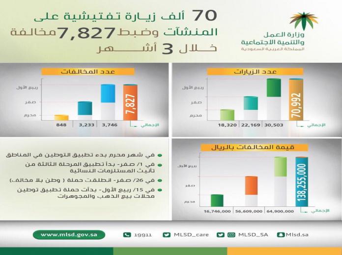 ضبطت الحملات التفتيشية المشتركة في الربع الأول من العام الهجري الجاري، 7827 مخالفة في سوق العمل، من خلال تنفيذ 70.992 زيارة تفتيشية ميدانية على منشآت القطاع الخاص، في كافة المناطق، للتحقق من تطبيق أنظمة سوق العمل ومتابعة قرارات التوطين، إذ بلغت قيمة المخالفات المضبوطة 138.255 مليون ريال.