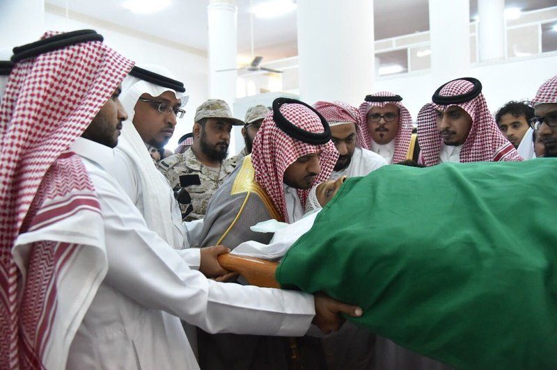 توشح جثمان الشهيد العريف ماجد بن موسى موكلي (28 سنة)، بالقوات المسلحة، دفاعًا عن الوطن بالحد الجنوبي، بعلم المملكة مكشوف الوجه أثناء تشييعه.