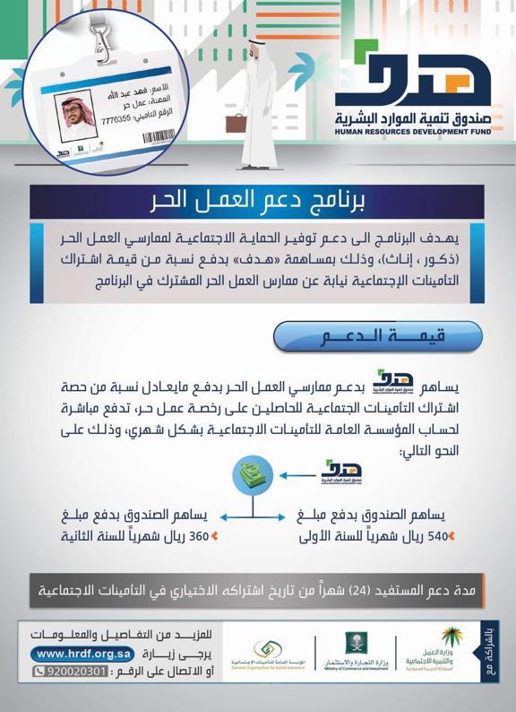 أعلن برنامج دعم العمل الحر التابع لصندوق تنمية الموارد البشرية أنه سيقوم بدفع نسبة من قيمة اشتراك التأمينات الاجتماعية نيابةً عن ممارس العمل الحر المشترك في البرنامج.