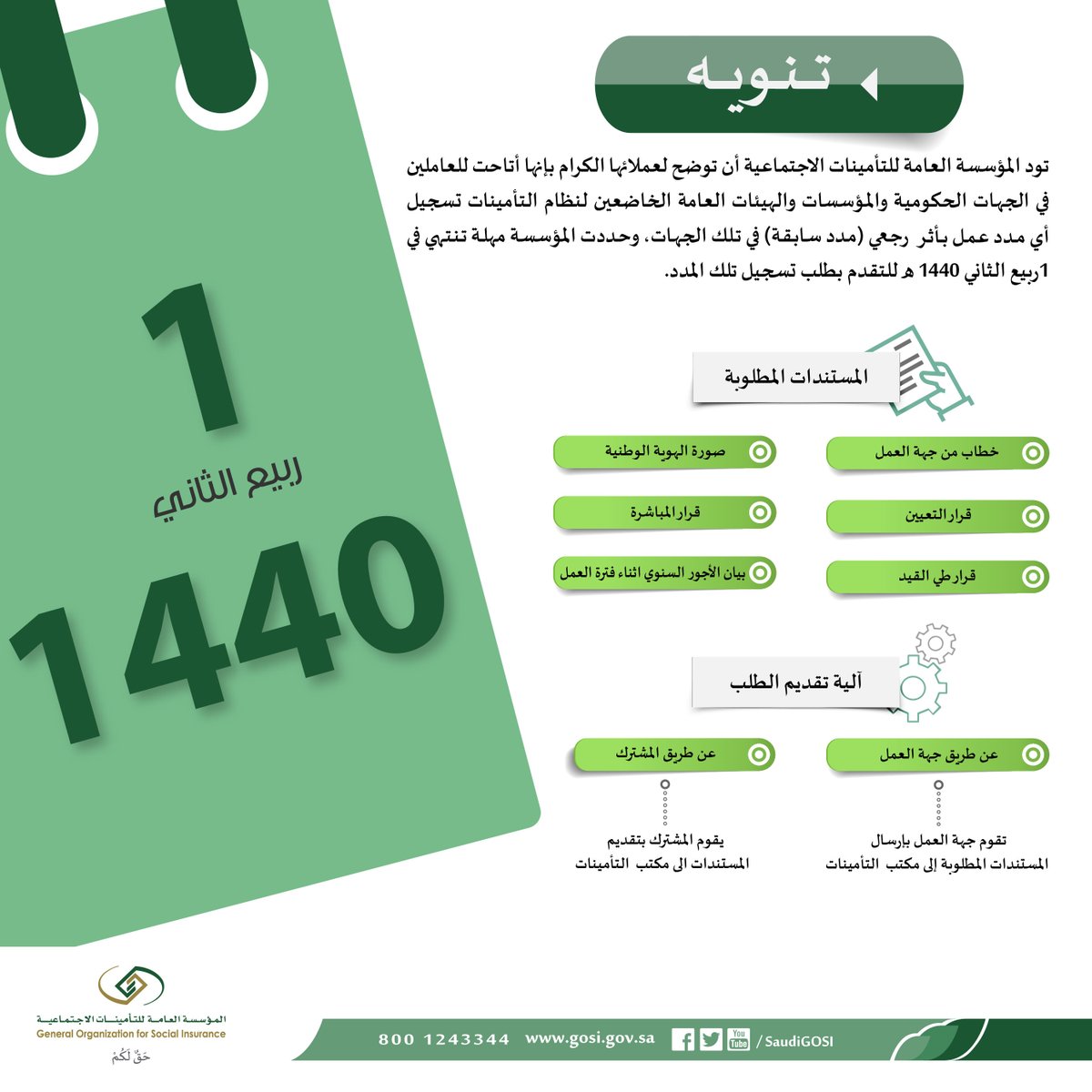 وأوضحت المؤسسة العامة للتأمينات في تغريدة عبر حسابها في “تويتر”، أنه المهلة تنتهي في غرة ربيع الآخر 1440هـ للتقدم بطلب تسجيل تلك المدد.