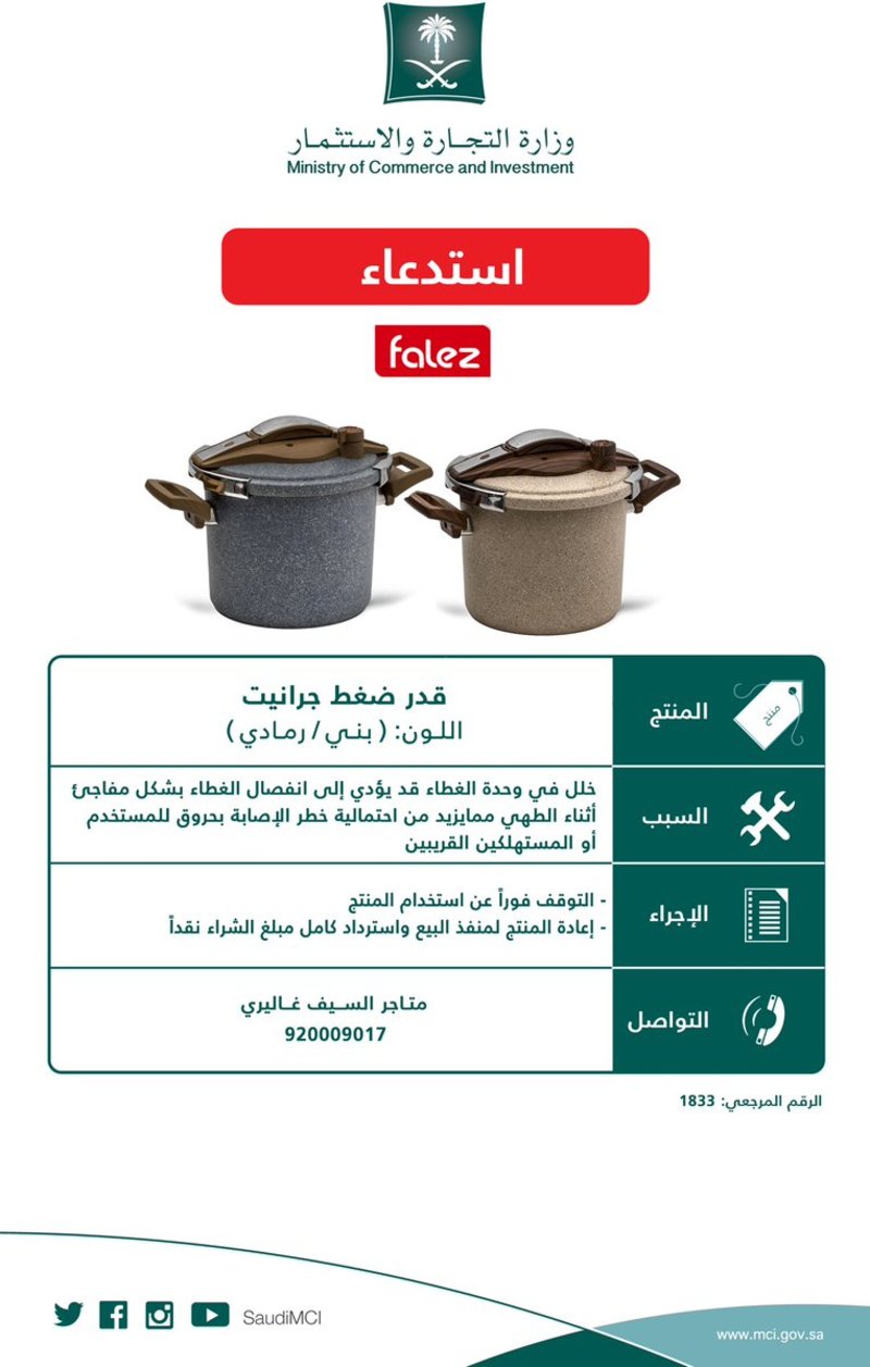 وقالت التجارة، في تغريدة عبر حسابها في “تويتر”: إنه تم استدعاء المنتج لخلل في وحدة الغطاء قد يؤدي إلى انفصاله بشكل مفاجئ في أثناء الطهي ما يزيد من احتمالية خطر الإصابة بحروق.