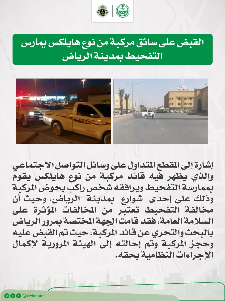 قبض مرور منطقة الرياض على سائق مركبة من نوع هايلكس يمارس التفحيط بالمدينة.