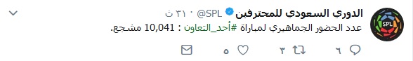 وكان حساب الدوري السعودي للمحترفين الرسمي على موقع التدوينات القصيرة “تويتر”، قد أكد أن عدد الحضور الجماهيري في مباراة أحد والتعاون بلغ 10 آلاف و41 مشجع.