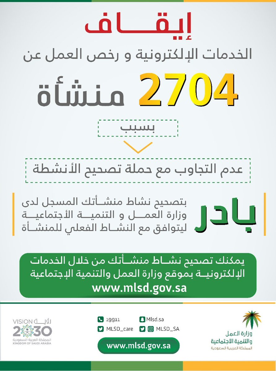 كشف المتحدث الرسمي لوزارة العمل والتنمية الاجتماعية خالد أباالخيل، عن إيقاف خدمات الوزارة الإلكترونية ورخص العمل عن 2704 منشآت في سوق العمل لم تتجاوب مع حملة تصحيح الأنشطة التي أطلقتها الوزارة مؤخرًا.