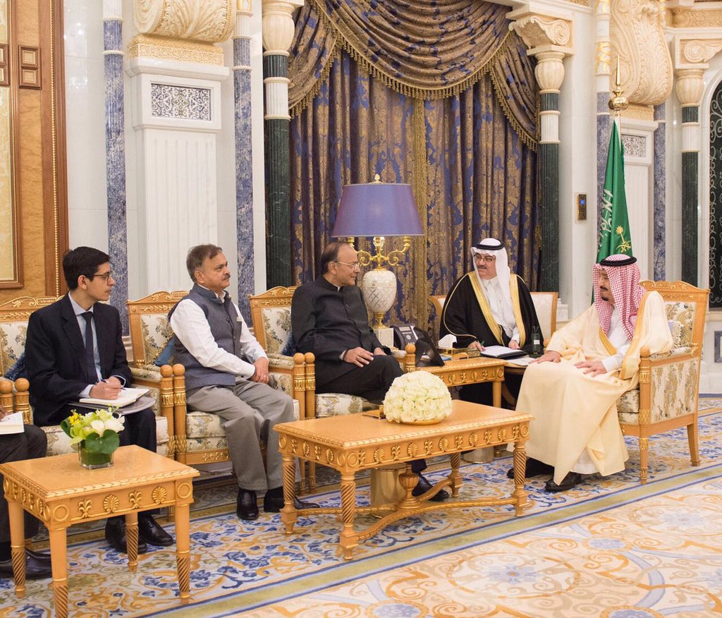 استقبل خادم الحرمين الشريفين الملك سلمان بن عبدالعزيز آل سعود ـ حفظه الله ـ في مكتبه بقصر اليمامة في الرياض اليوم، معالي وزير المالية بجمهورية الهند رئيس الجانب الهندي باللجنة السعودية الهندية المشتركة أرون جيتلي.