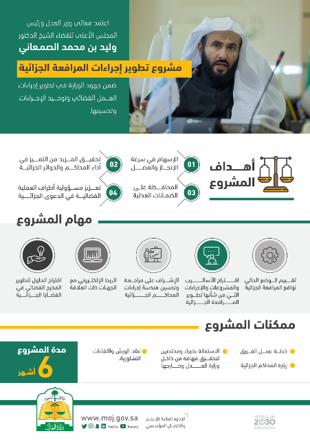 وجه وزير العدل الشيخ الدكتور وليد الصمعاني بتشكيل فريق متخصص لإدارة مشروع “تطوير إجراءات المرافعة الجزائية”، بهدف الإسهام في سرعة الإنجاز والفصل في القضايا، وتحقيق المزيد من التميز في أداء المحاكم والدوائر الجزائية، والمحافظة على الضمانات العدلية، وتحقيق التوافق مع مسؤولية أطراف العملية القضائية في الدعاوى.