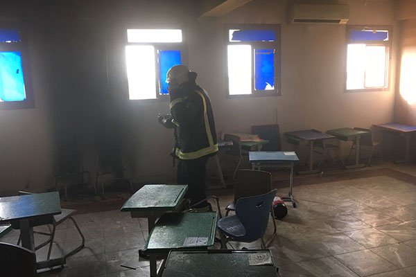 وباشرت فرق الدفاع المدني وقامت بعملية الإطفاء واتخاذ الإجراءات الوقائية واتضح أن النيران وصلت إلى طاولات وكراسي الطلاب وتوجد تلفيات في بعض الجدران.