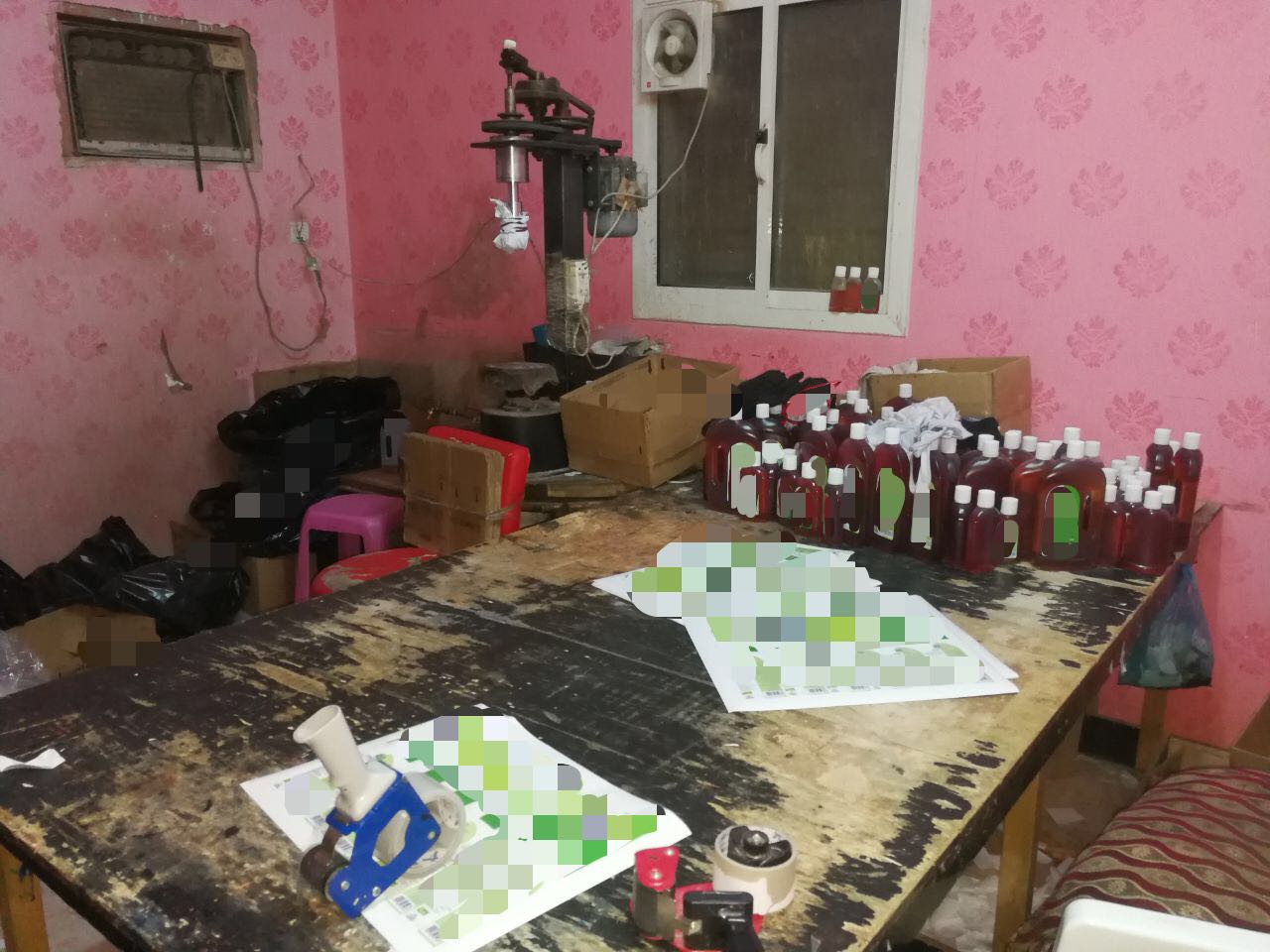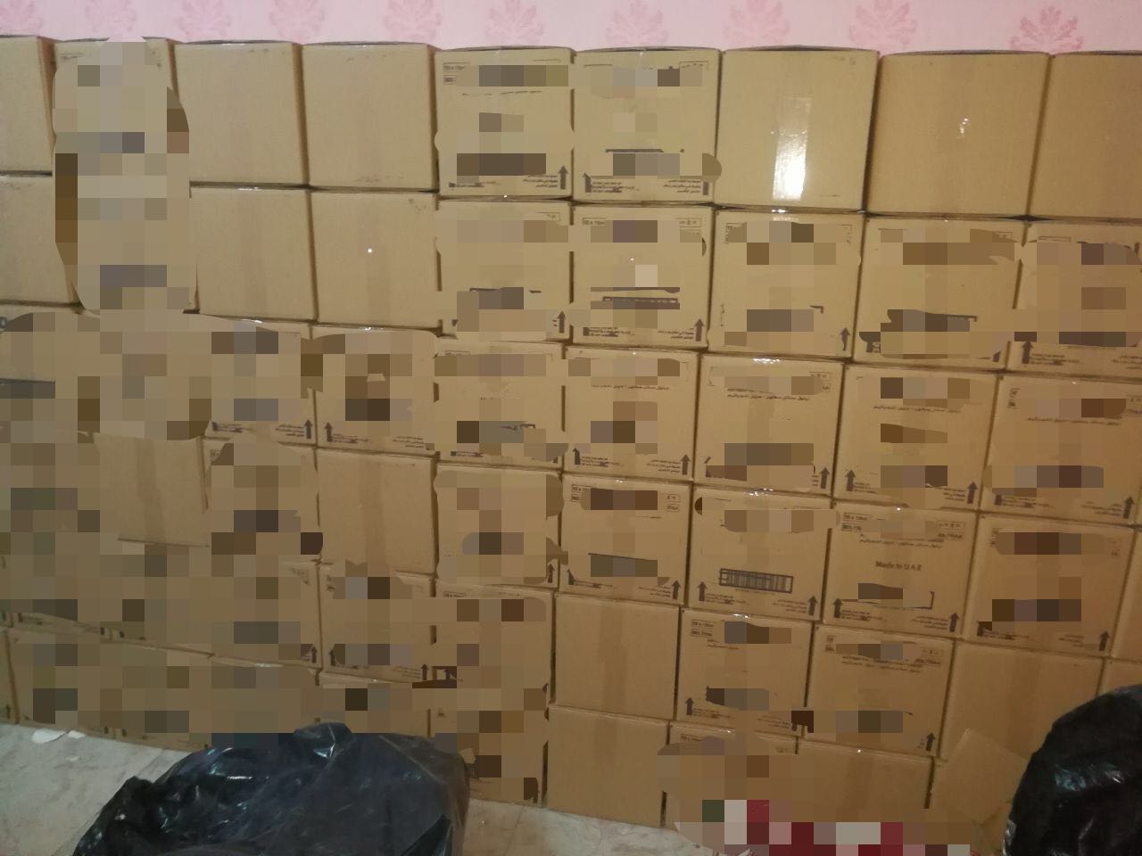 وتم ضبط خزان يحتوي على مادة سائلة منظفة مجهولة المصدر، وعدد (٨) حاويات كبيرة الحجم مليئة بالمساحيق والكريمات المغشوشة، وعدد (١١٥.٠٠٠) كرتون تغليف فارغ، وقرابة مليوني علبة بلاستيكية فارغة وبعضها مجهزة للبيع، وملصقات تجارية مزيفة جاهزة، ومعدات كبس ونماذج كربونية تُستخدم لنسخ العلامات التجارية المزيفة وطباعتها، وجرى تحريز المضبوطات وإحالة جميع الأشخاص لجهة الاختصاص لتطبيق الأنظمة والتعليمات بحقهم.