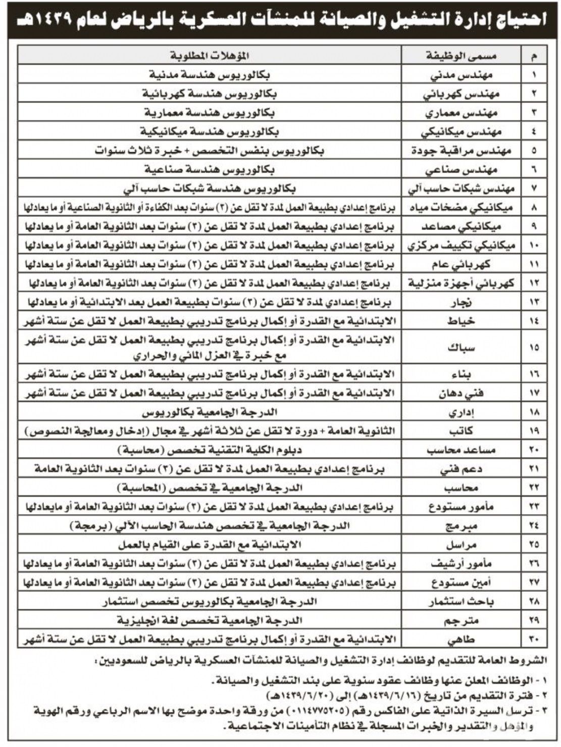 ونوهت إدارة التشغيل والصيانة للمنشآت العسكرية في القوات المسلحة بالراغبين في التقديم إرسال السيرة الذاتية على الفاكس رقم (0114775205) من ورقة واحدة موضح بها الاسم الرباعي ورقم الهوية والمؤهل والتقدير والخبرات المسجلة في نظام التأمينات الاجتماعية ولمزيد من المعلومات حول الوظائف وتفاصيلها عبر الإعلان المرفق أدناه: