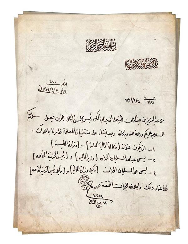 نشرت وزارة المالية صورة لوثيقة نادرة بخط المؤسس الملك عبدالعزيز بن عبدالرحمن آل سعود لأمر تعيين الشيخ عبد الله بن سليمان الحمدان أول وزير للوزارة.