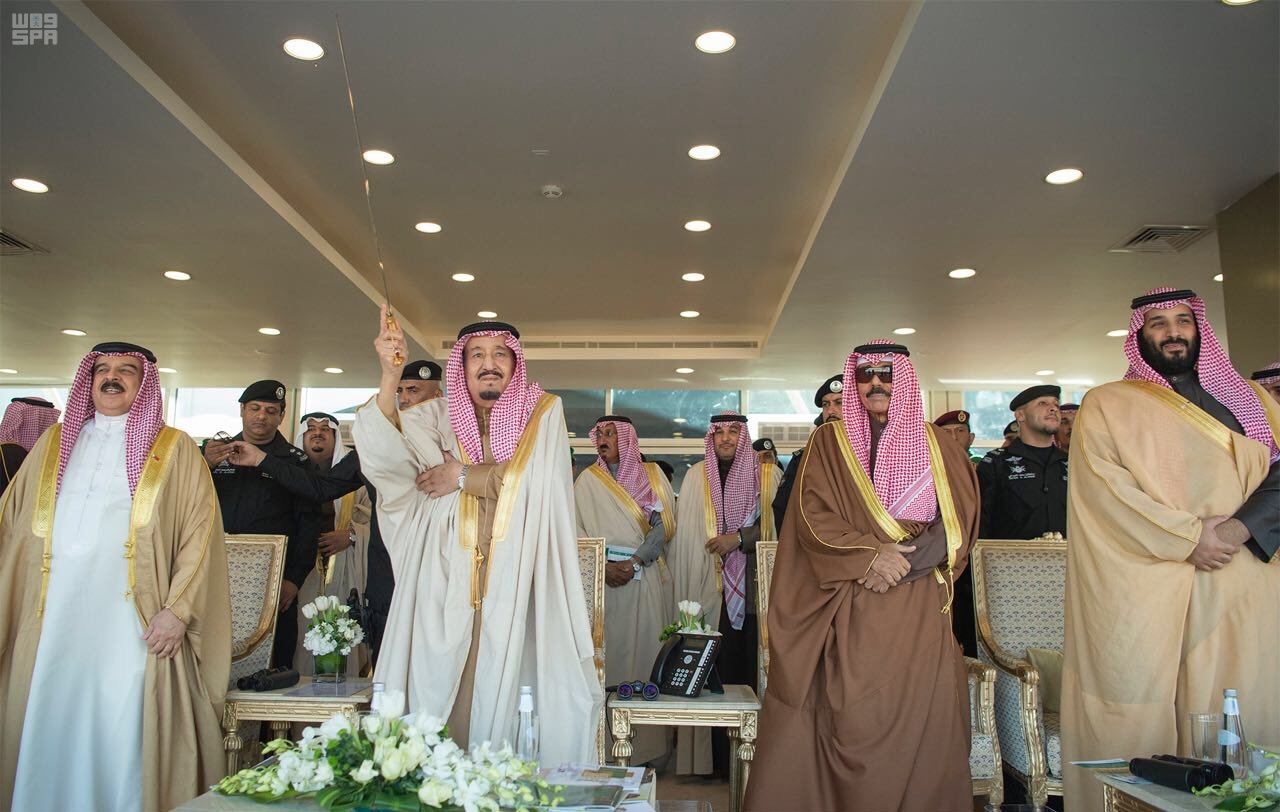 شارك خادم الحرمين الشريفين الملك سلمان بن عبدالعزيز في أداء العرضة السعودية خلال رعايته الحفل الختامي لمهرجان الملك عبدالعزيز للإبل.
