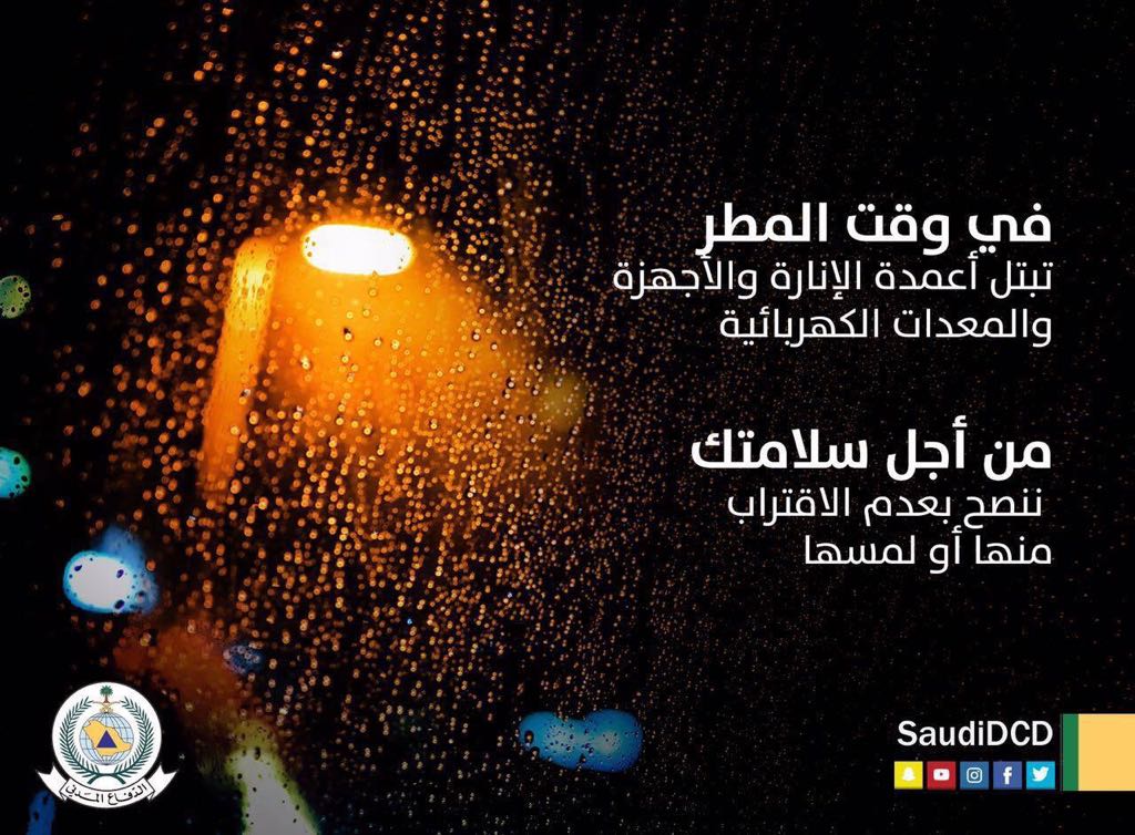 نصح الدفاع المدني، اليوم السبت، المواطنين والمقيمين بعدم الاقتراب من أعمدة الإنارة أثناء الأمطار.