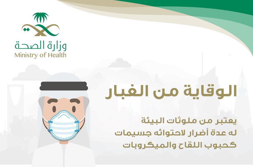 وقالت الصحة في تغريدة عبر حسابها في “تويتر”: إن الغبار يعتبر من ملوثات البيئة، وله عدة أضرار لاحتوائه جسيمات كحبوب اللقاح والميكروبات.