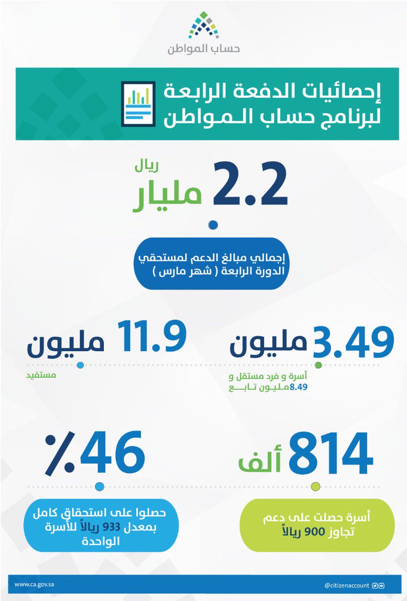 وأوضح حساب المواطن ، في تغريدة عبر “تويتر”، أن إجمالي الدعم بلغ 2.2 مليار ريال لمستحقي الدورة الرابعة لشهر مارس، شملت 3.49 مليون أسرة وفرد مستقل و8.49 مليون تابع، و11.9 مليون مستفيد.