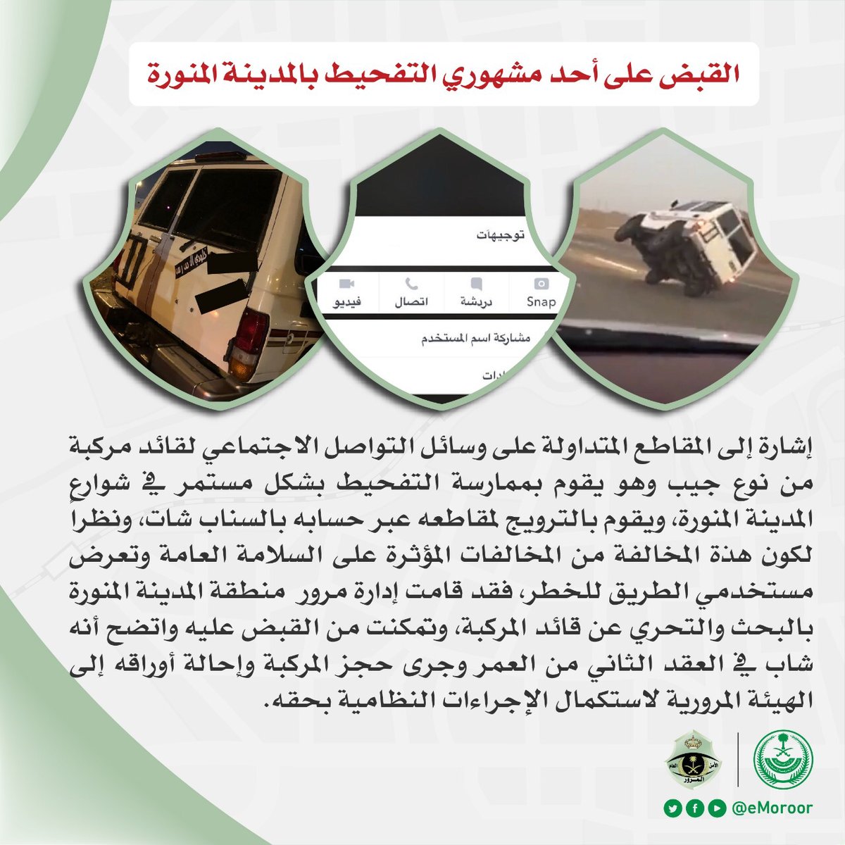 وقال المرور السعودي في بيان له: إنه بالإشارة إلى قيام أحد الأشخاص بالتفحيط في شوارع المدينة المنورة مستخدماً الجيب، والقيام بمشاركة المقاطع والصور عبر سناب شات، فقد تمت متابعته والتحري عنه، حيث تم القبض عليه، وتبين أنه شخص في العقد الثاني من العمر.