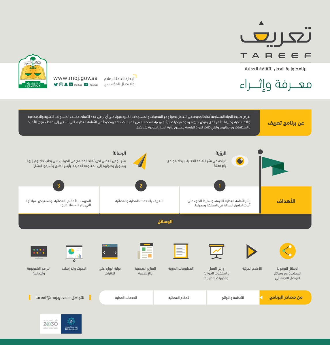 أتمت وزارة العدل إطلاق برنامج “تعريف”، الذي يستهدف نشر الثقافة العدلية بين أفراد المجتمع وتعريفهم بحقوقهم الشرعية وواجباتهم، ضمن مبادرة “إبراز مميزات القضاء ونشر الثقافة العدلية” التي اعتمدت ضمن مبادرات وزارة العدل في برنامج التحول الوطني 2020.