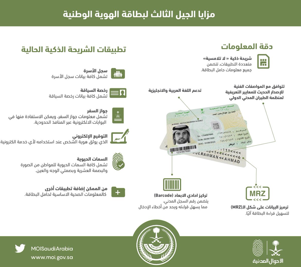 يُذكر أن البطاقة الجديدة تدعم أيضًا اللغتين العربية والإنجليزية وروعي فيها استخدام أفضل التقنيات الحديثة والمواد المقاومة للتلف، وتتوفر بها أعلى معايير السمات الأمنية لحمايتها من التزوير.