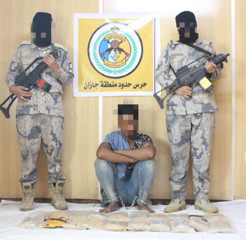 وأوضح المتحدث الرسمي لحرس الحدود، العقيد ساهر الحربي، أنّه في إطار الجهود الأمنية المستمرة لمكافحة تهريب المخدرات عبر الحدود البرية والبحرية للمملكة، فقد تم رصد عدة محاولات لتهريب المواد المخدرة عبر حدود المملكة البرية في مسؤوليات منطقتي جازان ونجران، مما حتم التعامل معهم بما يقتضيه الموقف، وأسفر عن ذلك القبض على عدد (24) مهربًا من الجنسية الإثيوبية ومهرب يمني الجنسية ومهربين صوماليي الجنسية.