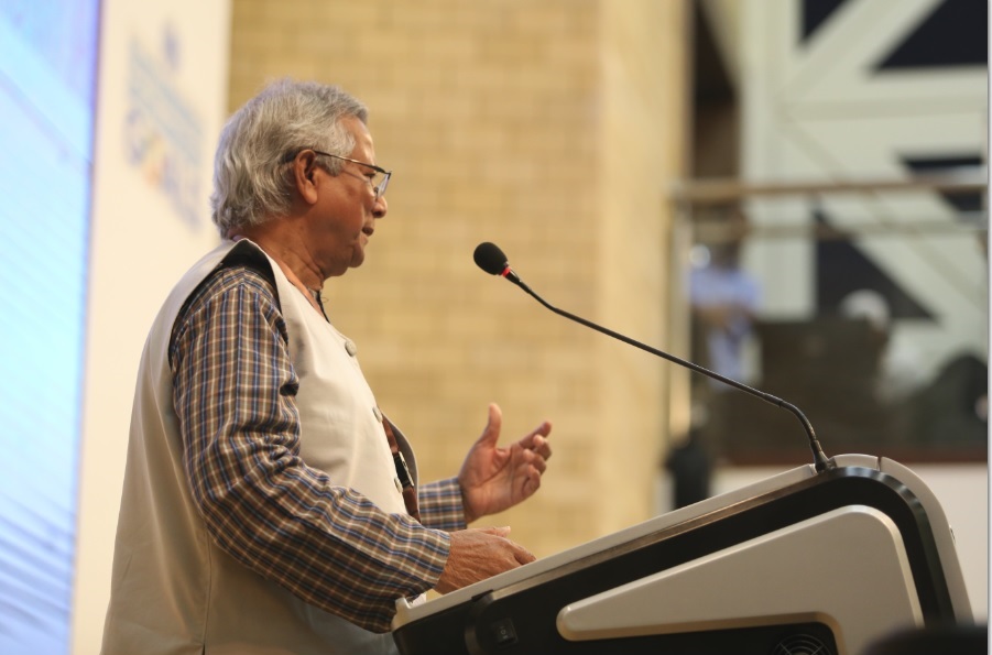 وأشار يونس في كلمته: أكبر حقيقة اكتشفتها في حياتي أن معظم المتعاملين مع بنك غرامين ليس لديهم إلمام بالكتابة والقراءة، ومعظمهم من النساء، ولكن لديهم مهارات وقدرات تفوق ما لدى المتعلمين.