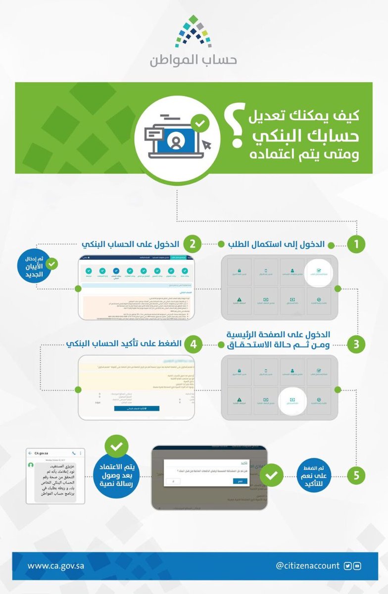 ونشر البرنامج، تغريدة في حسابه الرسمي على موقع “تويتر”، تضمنت الخطوات التي توضح كيفية تعديل الحساب البنكي، باستكمال الطلب ثم الدخول إلى الحساب البنكي وإدخال الآيبان الجديد، وبعدها الدخول إلى الصفحة الرئيسة، ومن ثم حالة الاستحقاق، ثم الضغط لتأكيد الحساب البنكي الجديد، إذ يتم اعتماد التعديل وإرسال رسالة نصية على الهاتف المسجل في البيانات”.
