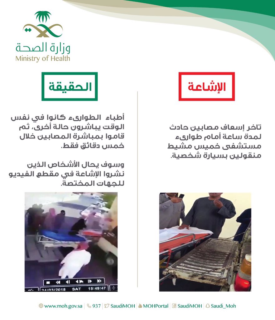 ردت وزارة الصحة على شائعة تأخر إسعاف مصابي حادث لمدة ساعة أمام طوارئ مستشفى خميس مشيط منقولين بسيارة شخصية.