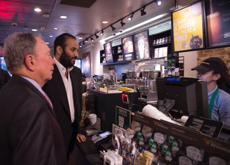 في ظل الجدول المزدحم بالعمل واللقاءات ، توقف ولي العهد الأمير محمد بن سلمان و مايكل بلمومبيرغ مؤسس شبكة بلومبيرغ وحاكم مدينة نيويورك سابقاً في أحد المقاهي بنيويورك.