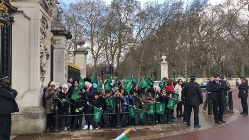 ورفع المواطنون المقيمون في بريطانيا وكذلك البريطانيون من مختلف الأعمار والفئات، الذين احتشدوا أمام القصر، الأعلامَ ورددوا الهتافات الترحيبية احتفاءً بولي العهد في زيارته التاريخية للمملكة المتحدة.