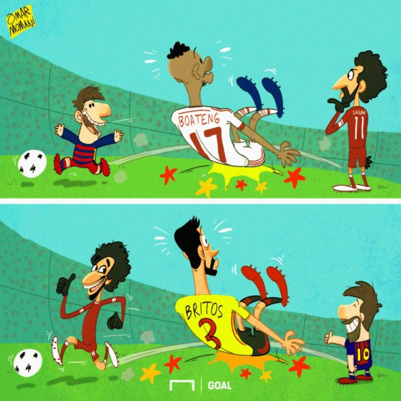 وهو نفس الأمر الذي قام به ميسي خلال مباراة برشلونة أمام بايرن ميونيخ الألماني بدوري أبطال أوروبا، عندما راوغ النجم الأرجنتيني المدافع الألماني جيروم بواتينج قبل أن يسقط على الأرض ويسجل الهدف.