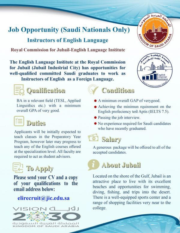 أعلن معهد اللغة الإنجليزية بكلية الجبيل الصناعية، عن توفر وظائف لمعلمي اللغة الإنجليزية من حملة شهادة البكالوريوس أو أعلى في تخصص تعليم اللغة الإنجليزية واللغويات التطبيقية.