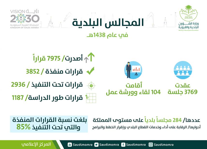 284 مجلساً بلدياً تعقد 3769 جلسة وتُصدر 7975 قراراً خلال عام 1438هـ